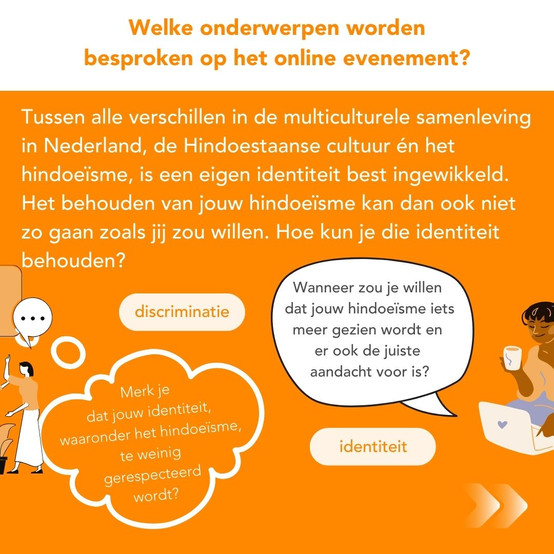 Wij zorgen voor een interactief programma. We gaan gezamenlijk in gesprek in verschillende online break-out rooms. We gaan het hebben over wat houdt dit onderwerp in? Hoe ervaar jij het hindoeïsme als jouw identiteit? Ben jij open over het hindoeïsme in jouw omgeving (werk, school, sport etc.)? Het tweede onderwerp dat aan bod zal komen is discriminatie. Wat leert het hindoeïsme ons hierover? Ervaar jij discriminatie of kun je juist een ander tips geven? Jouw aanwezigheid zal zeker waardevol zijn!